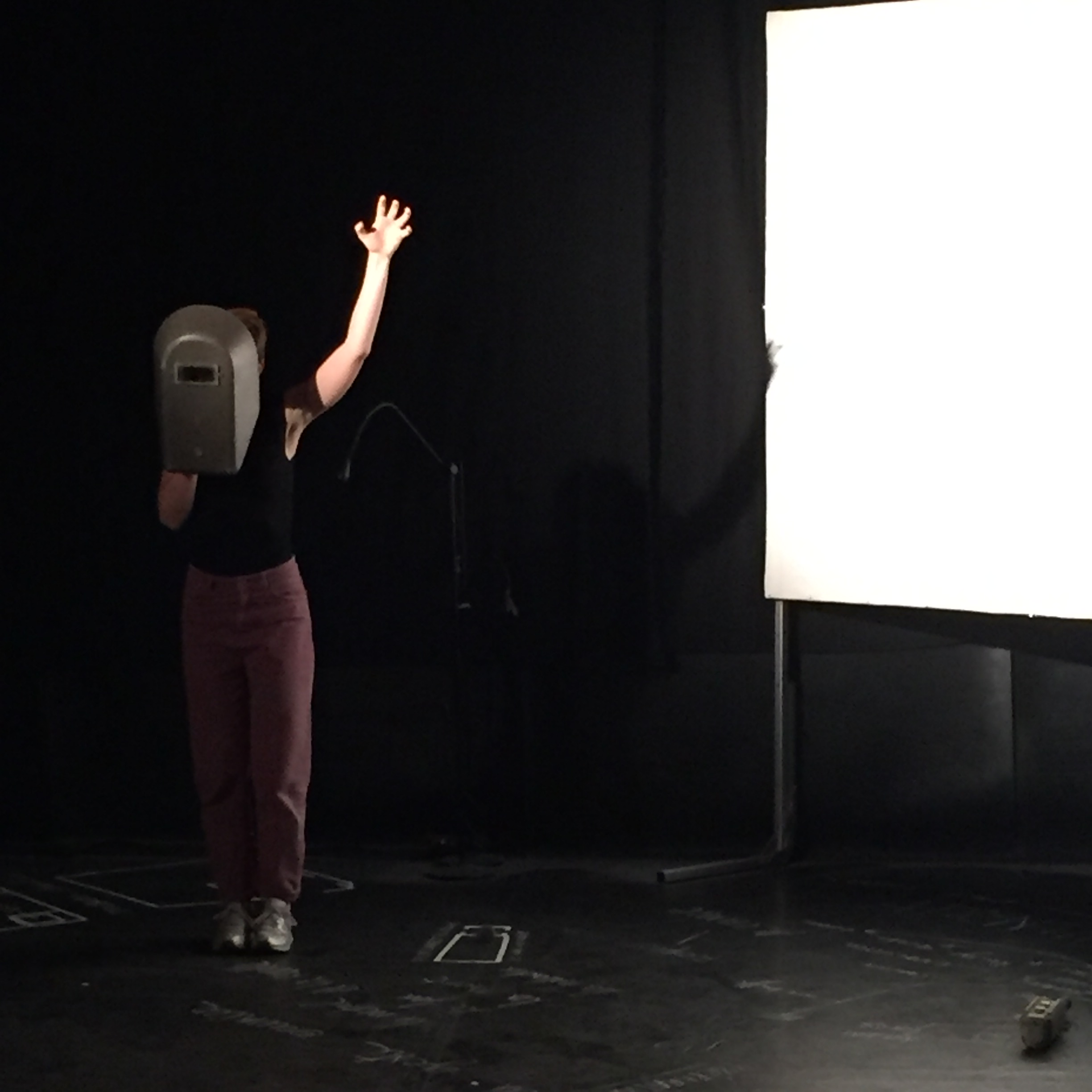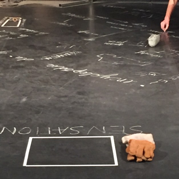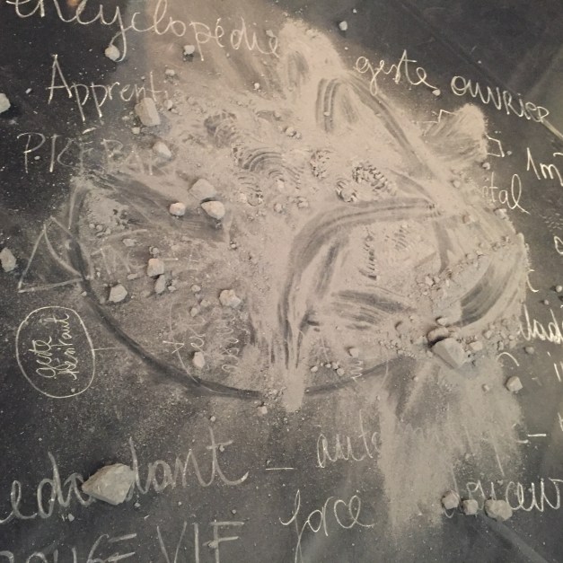 La scénographie émerge durant le temps de conférence et compose un paysage au plateau: écritures à la craie blanche sur le sol, projections de vidéos d’ouvriers au travail, témoignages sonores, objets disparates (gants, brique crue, sceau, boulon…).Au fur et à mesure, la pensée gigogne de l’artiste prend forme en une sorte de musée habité par des objets de travail. A la fin de la conférence les spectateurs sont invités à déambuler dans cet espace et ainsi poursuivre les échanges.