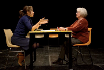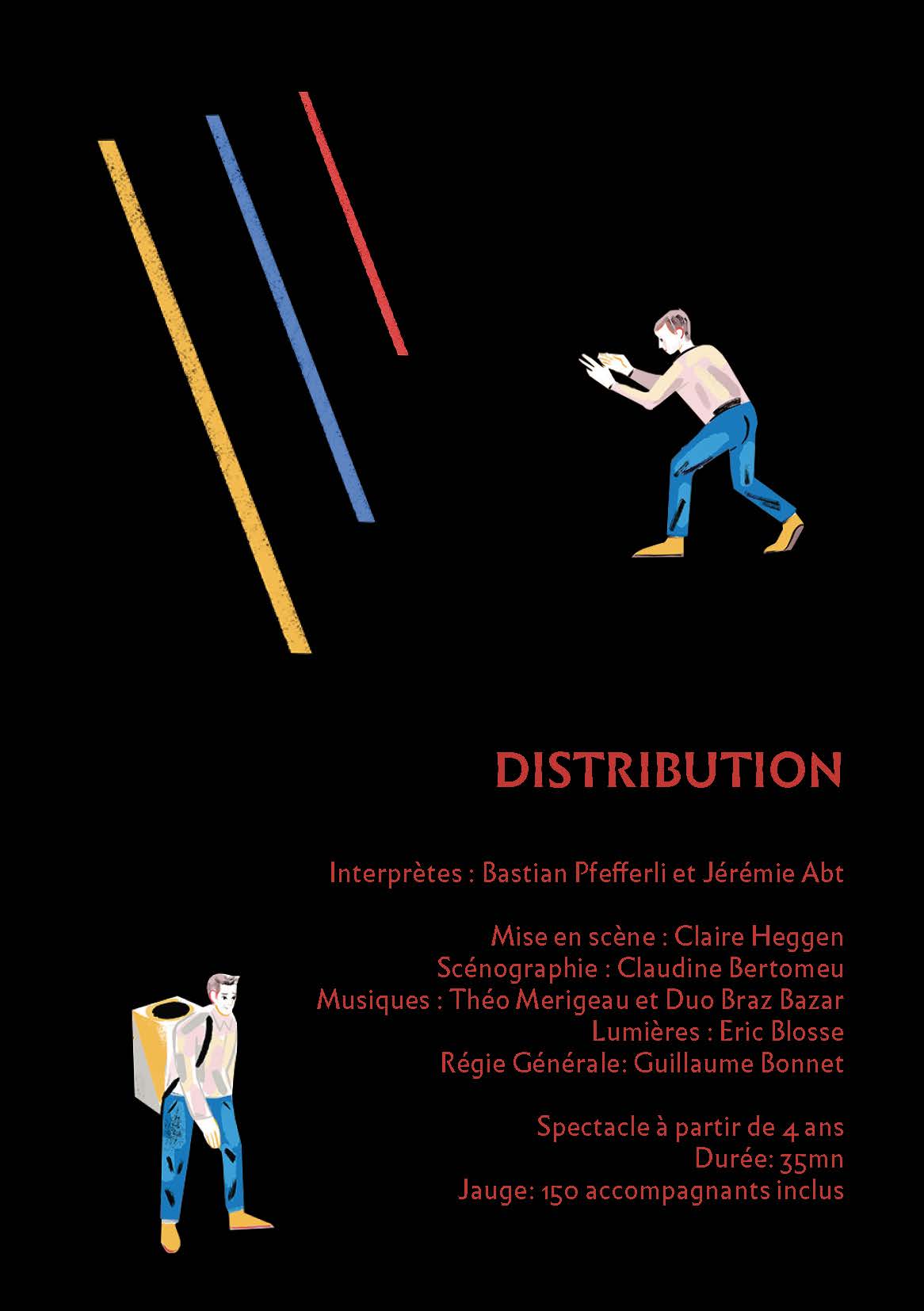 ressembler à un spectacle d’apprentissage. Avec l’artiste Anne Moirier, dont le travail réside dans le fait de détourner nos environnements quotidiens, la mise en scène fait le pari d’une installation comprenant des éléments de mobilier, six chaises, et une table, qui se reconfigurent à chaque séquence, et permettent de figurer de manière abstraite et concrète des extérieurs comme des intérieurs (rues, salon, cuisine…) en évitant ainsi tout naturalisme.