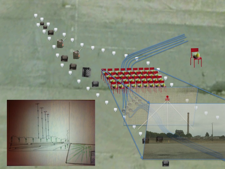 Des assises métalliques manufacturées identiques prennent place suivant une grille ordonnée et donnent à voir un premier plan : un tulle suspendu encadré, métaphore d’une ville qui regarde son territoire dressé devant elle. Par un rapport visuel d’échelle avec l’usine réelle, ce tulle fixe pour un instant la trace des cheminées. Quatre ampoules rouges seront attachées, elles esquisseront derrière le tulle le haut des cheminées à la manière des ballons rêvés. Le cadre-tulle prend place à l’intérieur de la limite proposée par les verres. De ce fait, une partie de ces derniers seront éclairés, comme la trace de la rive, ainsi la géographie se prolonge.