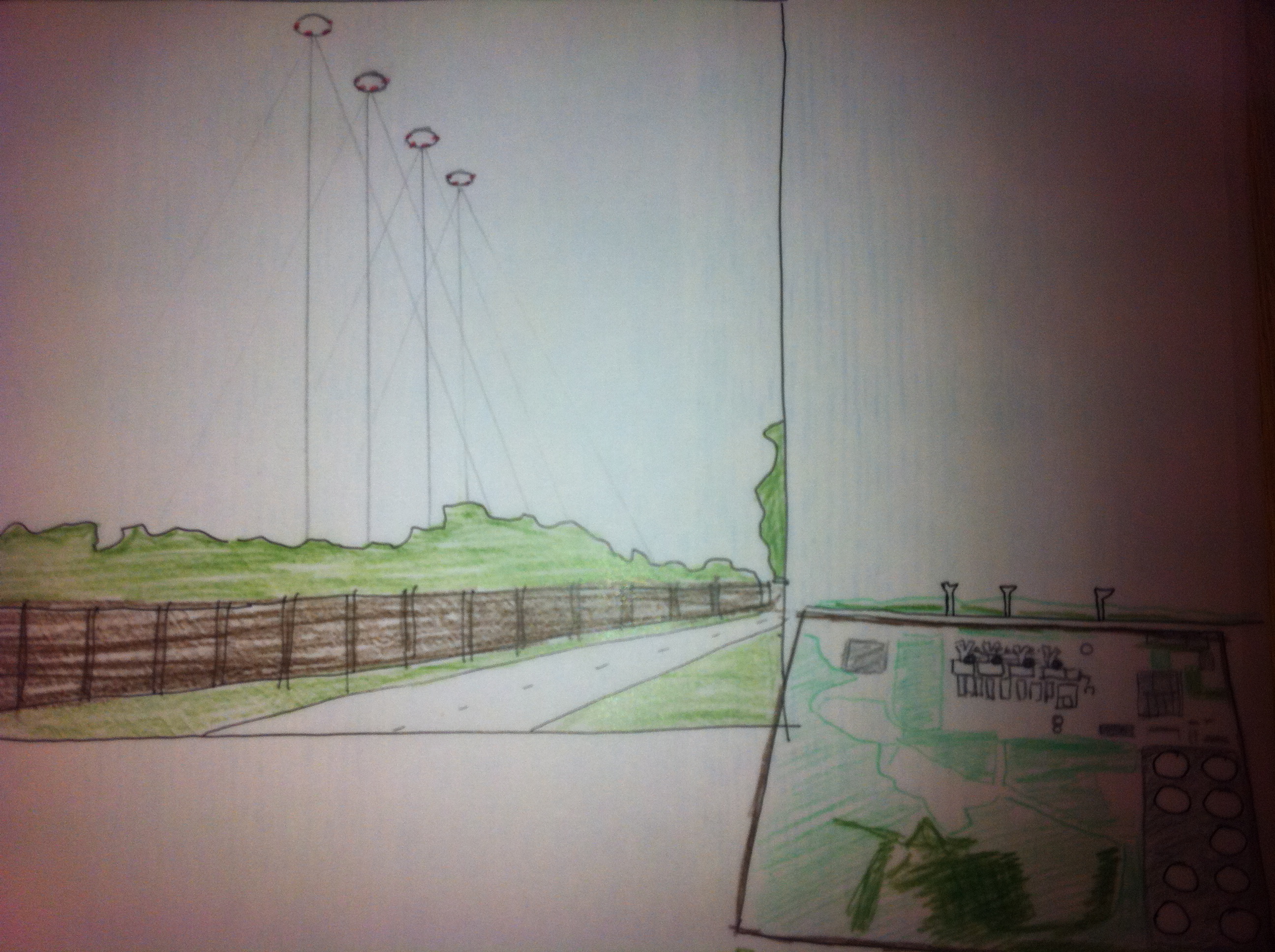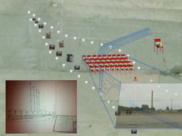 Des hauts parleurs-citernes alimentés par un réseau de câbles au sol en reflet des lignes H.T. découpant le paysage, diffuseront un texte écrit préalablement racontant les différents constats puis l’utopie imaginée. Un échange entre visiteurs pourra avoir lieu après l’écoute.